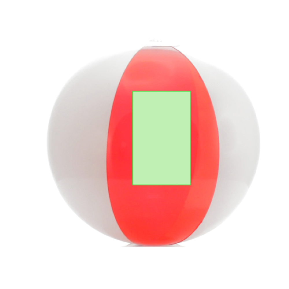 Opblaasbare strandbal van PVC in tweekleurig ontwerp van witte en transparante panelen in diverse kleuren.